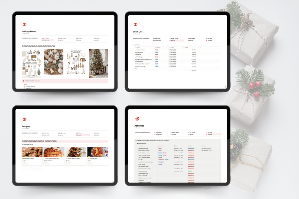 Our user-friendly dashboard is designed to simplify your holiday preparations and ensure a stress-free season. With 10 comprehensive sections, including People, Tasks, Cards, Gifts, Budget, Trips & Events, Decorations, Menu Planner, Cozy Activities, and Journal, this template provides a centralized hub for all your holiday planning needs.